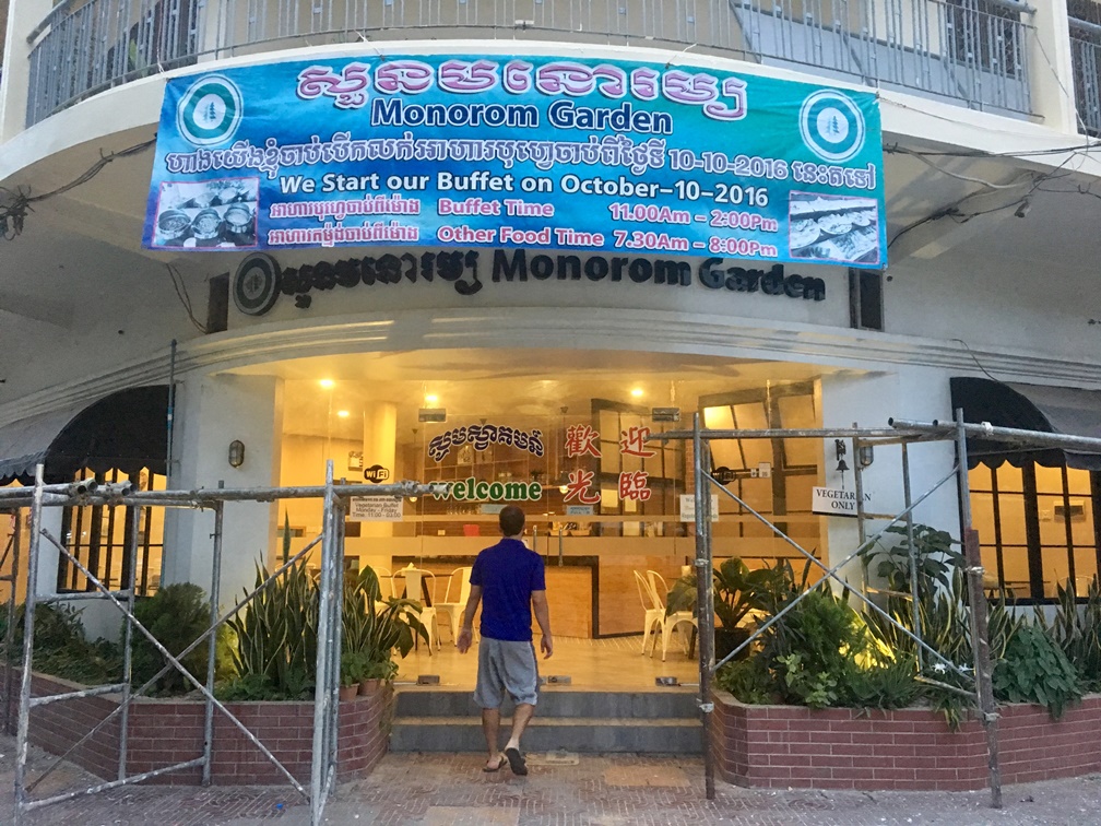 After checking in and parking our bikes in the hotel foyer (in what looked like a disused fountain) we head out for lunch at Monorom Restaurant, a vegetarian place across the road and one of the reasons I chose that particular hotel.