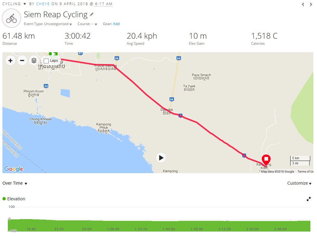 We continue on and get the worst headwind for the remaining 20km. Cheye leads the first 10km then I take over the remaining 10km. I’m pretty steady for the first 5km until Cheye says “You can use this as your training for today”. So I go into time trial mode for the last 5km, timing each km to beat the previous one. We arrive in Kampong Kdei nice and early at 9:30am and settle for the first guest house we come across so we can unload our gear.