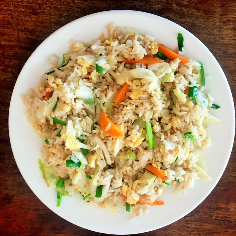 We can’t seem to find any food places apart from a giant, open restaurant that looks like a place buses stop for people passing through between Siem Reap and Phnom Penh. We decide to stop in and order some vegetable fried rice (USD $2.50 each).