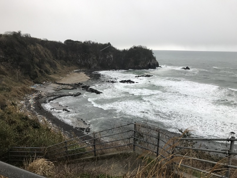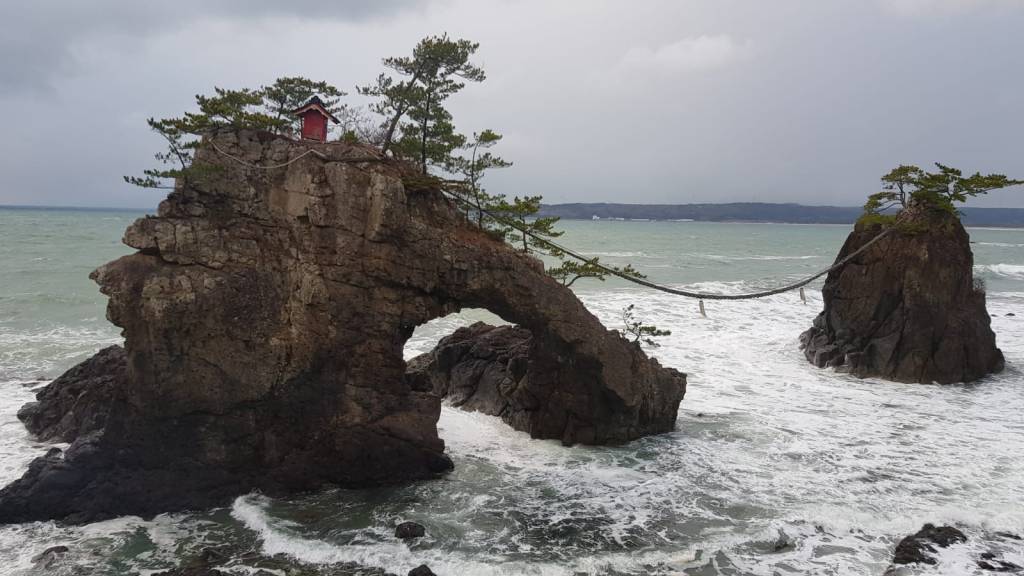 The last 17km is just as cold and the snow doesn’t stop falling. We take the coastal road at one point to avoid the highway tunnel and see the Hatagoiwa Rocks, which look pretty amazing with the waves crashing around them.