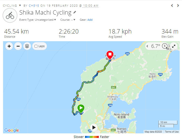 Distance cycled: 56km (46km of undulating coastal roads and a steady 2km climb before a huge descent into Wajima, plus an additional 10km cycling around town)