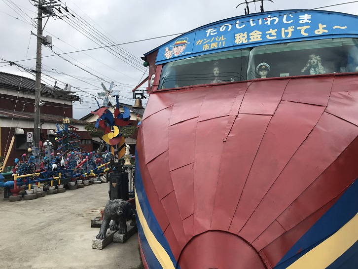 As we cycle around, we spot a strange looking display outside someone’s house. It looks like an art installation of random things and upon a bit of research I discover it’s called ‘Tin Shinkansen’ and there to make a bit of a statement from the traditional streets of Wajima.
