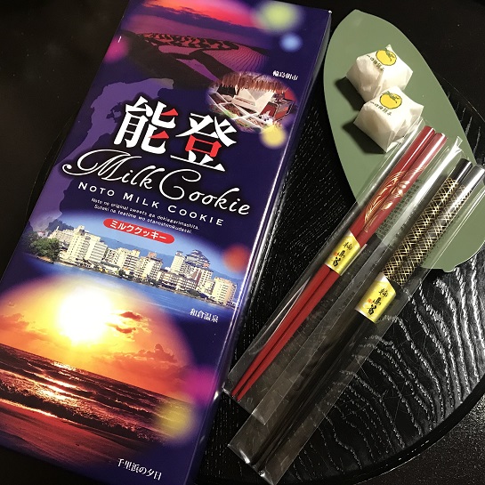 He’s using a cool translation egg to communicate with us which has a woman speak in English. Before he heads off he asks one last question: “If this is a cookie, please eat it” the woman’s voice translates. I’m confused and think something has been grossly lost in translation until he reveals a box he has been hiding behind his back and hands it to me – it’s a box of Noto Milk Cookies. He tells us that the Ryokan is his father’s business and the cookies are his own business. We thank him and he wanders off. He has also left us some chopsticks and yuzu mochi on the desk as a gift.