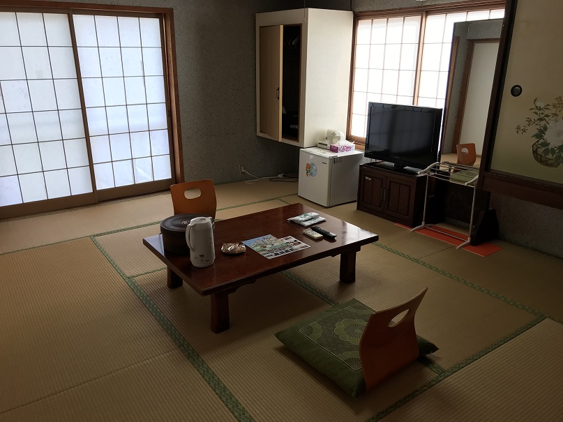 The lady owner greats us warmly and explains everything to us in Japanese with a few words of broken English. The room is massive with a table set up in the centre where we will later set up our futons.