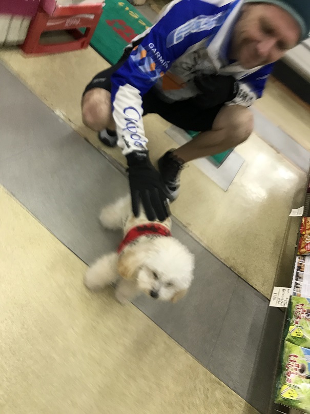 A small dog is hanging around the counter as we pay so of course Cheye becomes friends with him.