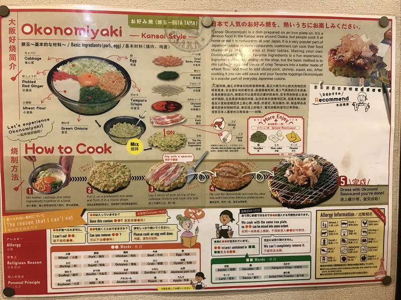 It’s nearly 6pm as we head back so we decide to swing by a local Okonomiyaki restaurant we had our eye on earlier. We are the first ones there and after asking for an English menu we order two vegetarian Okonomiyaki (Japanese savoury pancakes). On the wall next to our table is a poster showing you the process of cooking Okonomiyaki.