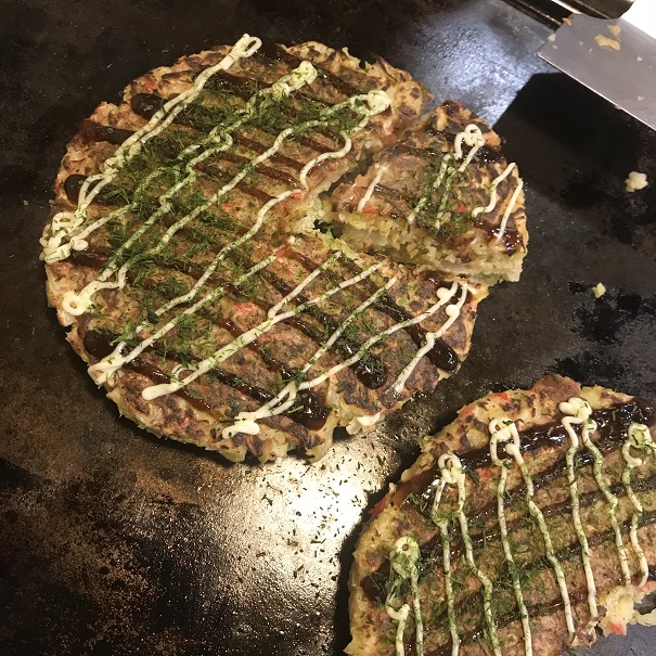 Each table has a grill plate on it as you mix and cook the ingredients yourself, however after waiting about 15 minutes the chef comes out and places the already cooked pancakes on the hot grill in front of us. I think after realising we were tourists they didn’t trust us to cook them ourselves ,even though we had done just that only a few days earlier in Shinjuku.