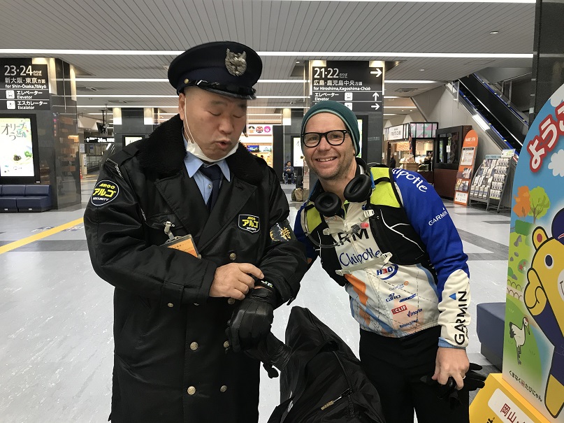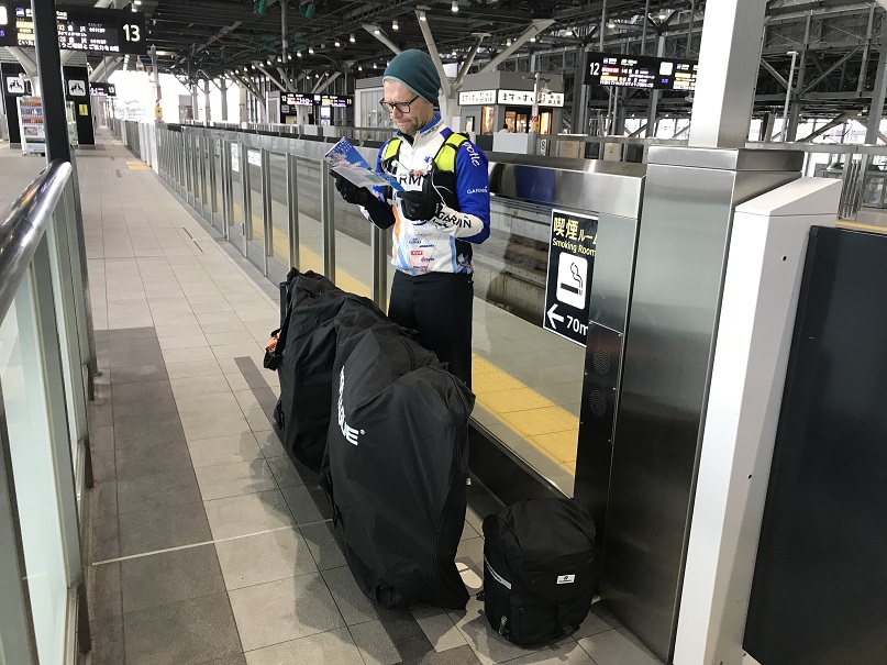 At our final transit station, we start chatting to one of the friendly station guards who is interested to hear about our cycling adventures and helps direct us to our next platform. Unfortunately he has his eyes closed when I take a photo.