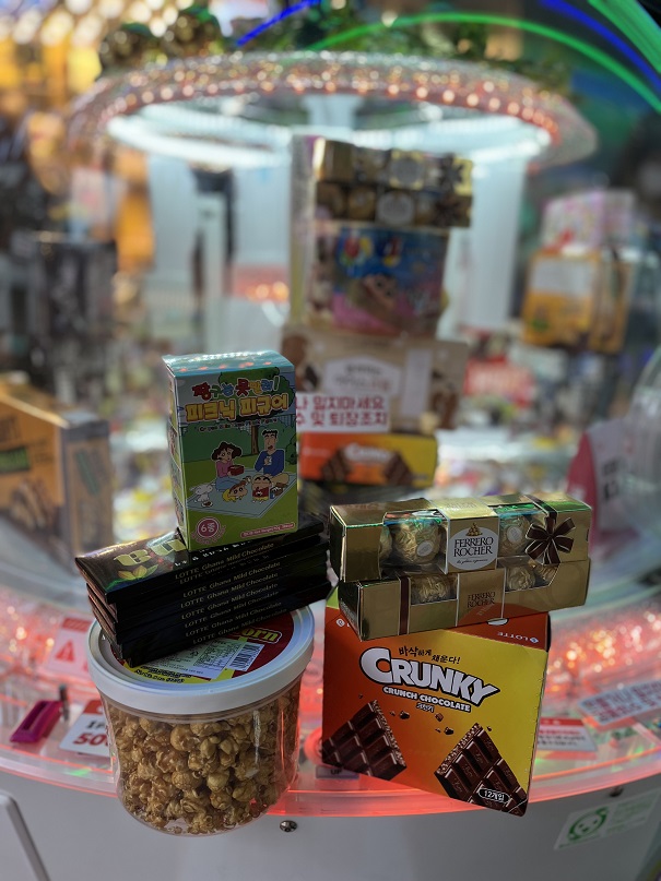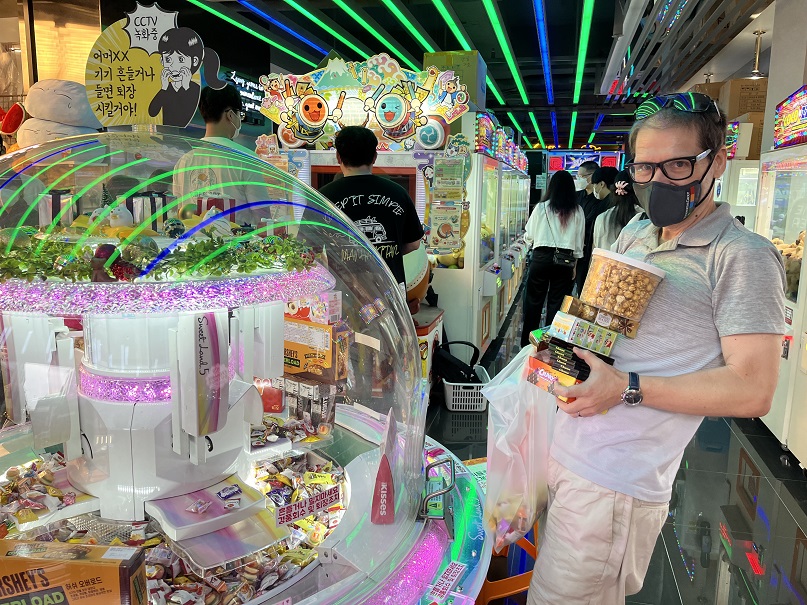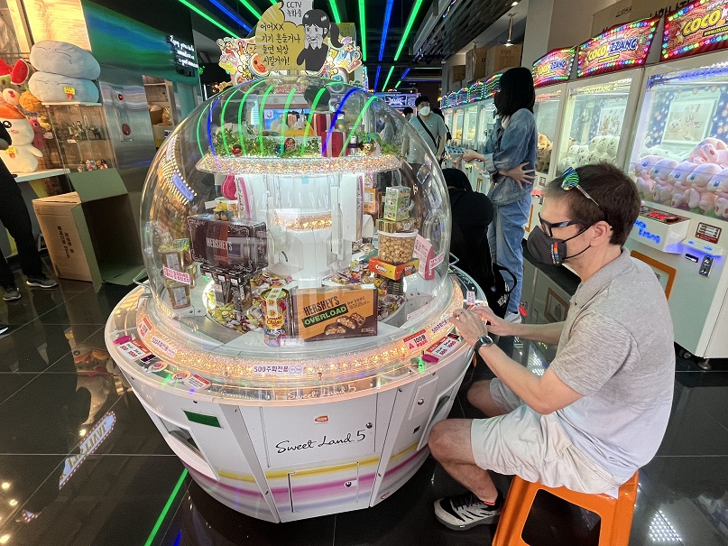 We pass by a busy looking arcade called Zzang Games so we pop in for a bit. Cheye spots a candy pusher machine and decides to have a crack…