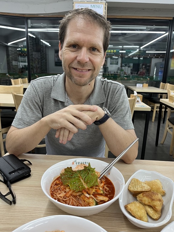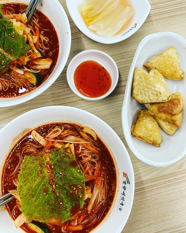 I do a search on the map and find Manghyang Bibim Guksu, a place that sells spicy noodles. We decide to head there for dinner, which is perfect as it’s just a short walk across the road.