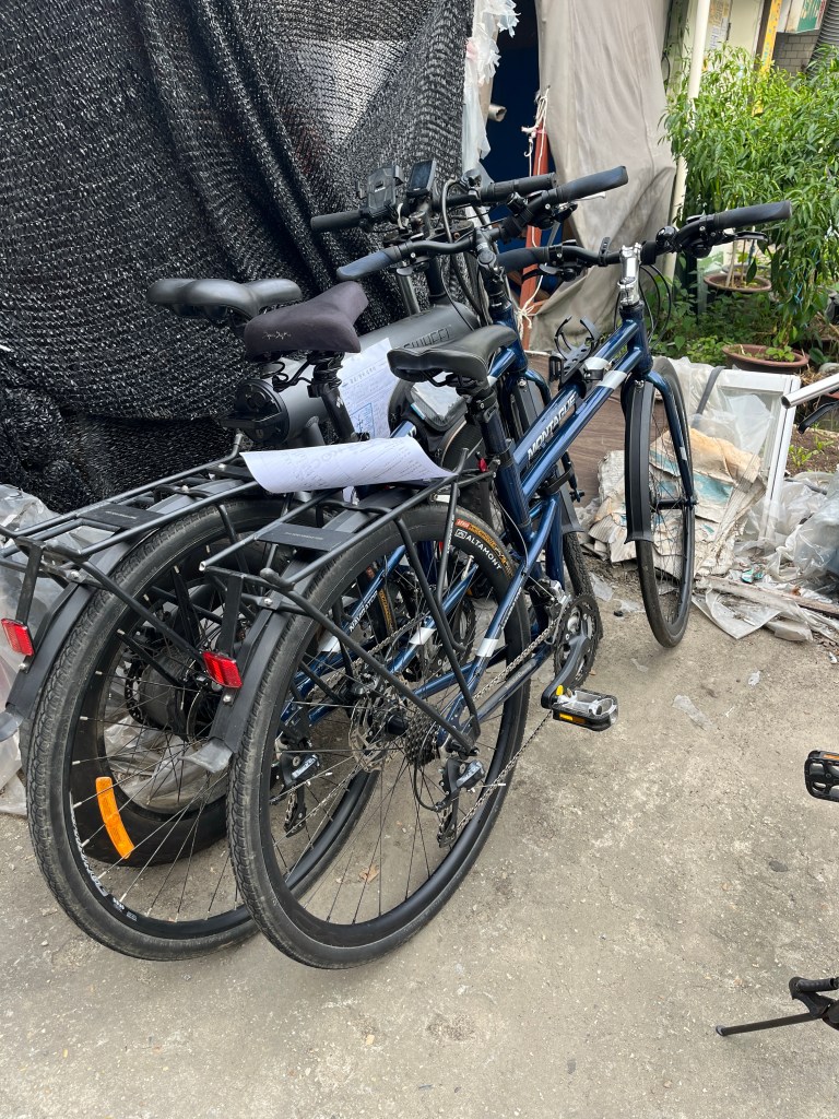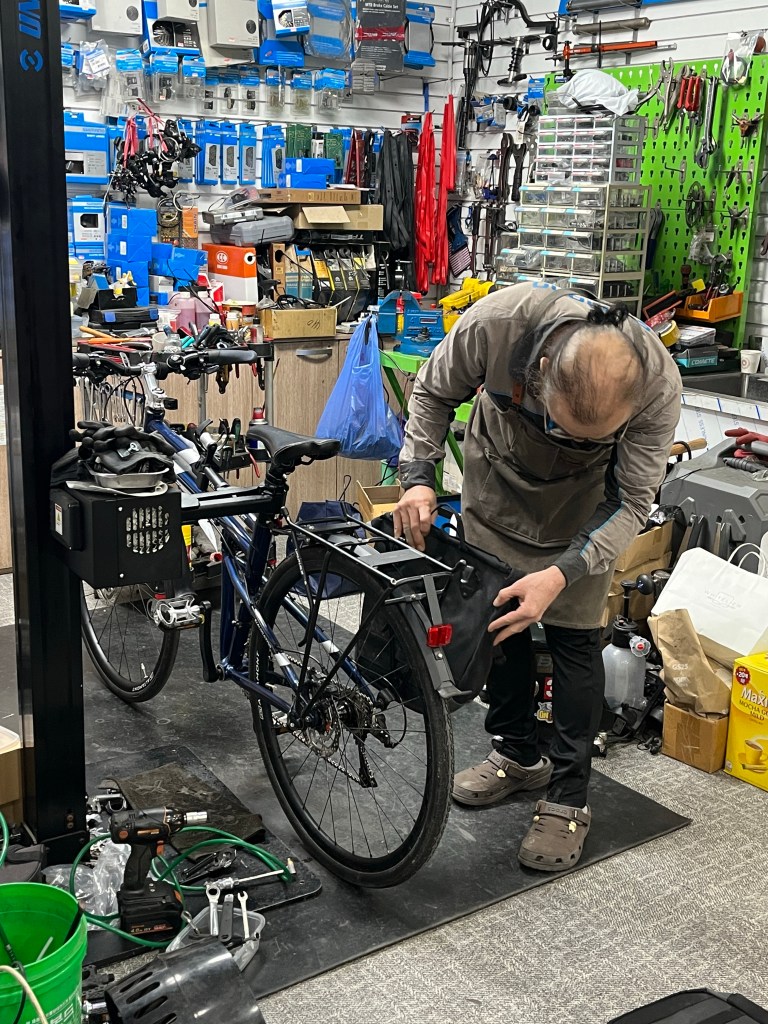 We arrive at the shop and a mum and daughter are also waiting for the shop owner to have the little girl’s bike repaired, which was the cutest thing. After attending to her bike, he wheels our bikes in and we ask if he stocks panniers.