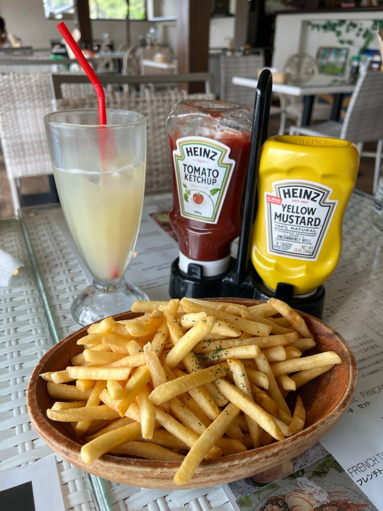 We haven’t had breakfast and decide to carb load with some fries and drinks.