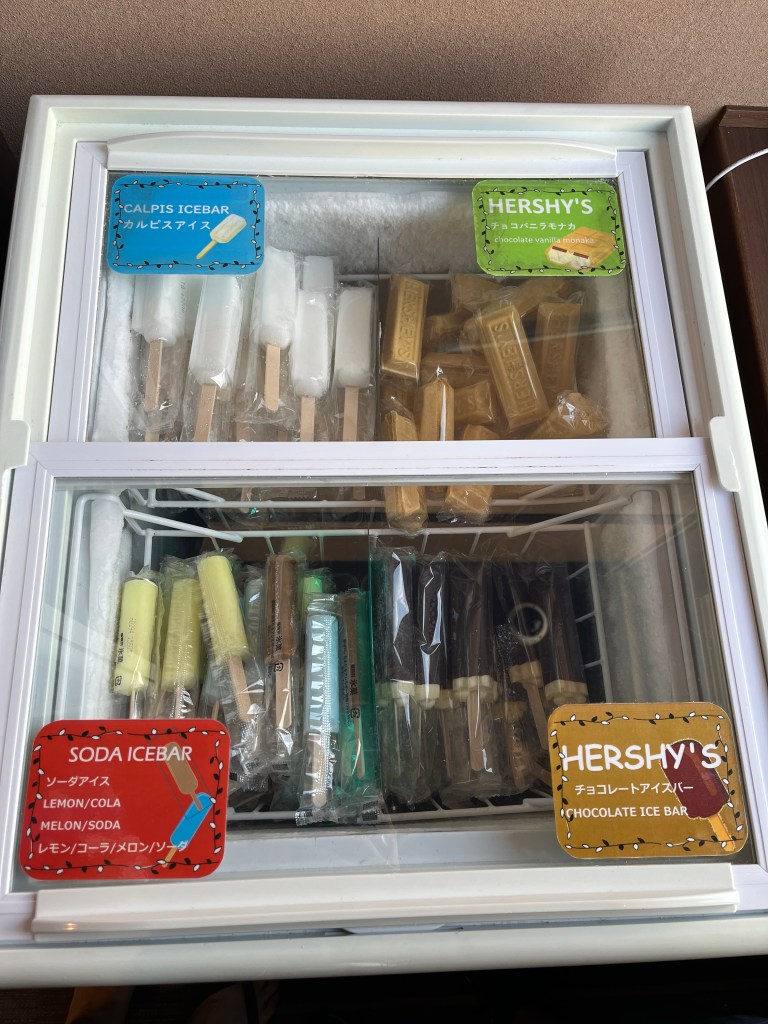 We notice our hotel has a bunch of included extras for its guests. These include free ice pops, ramen and Yakult, a public onsen and free use of the massage chairs and manga.