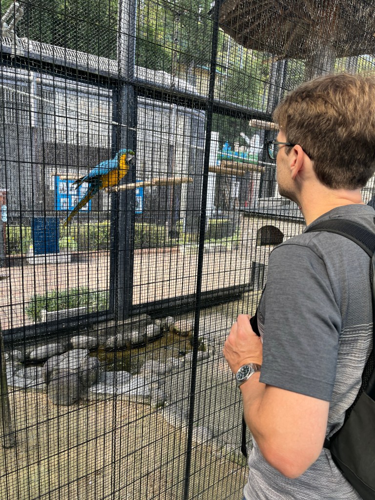 Cheye stops to talk to the parrot but it must only speak Japanese.