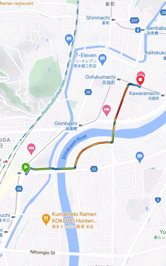 The rain is still quite heavy when we arrive at Kumamoto JR Station at 2:25pm. We shelter ourselves from the rain outside a nearby shop and unpack our bikes. It’s only a 1.3km ride to our hotel but luckily the rain is easing up.