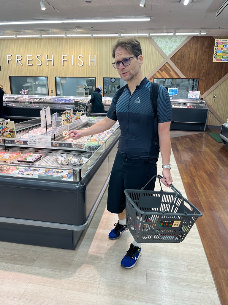 As we approach the town of Taketa the food options seem pretty slim. We decide to drop into a big supermarket called Sunlive about 3km from our hotel and pick up some dinner for later.