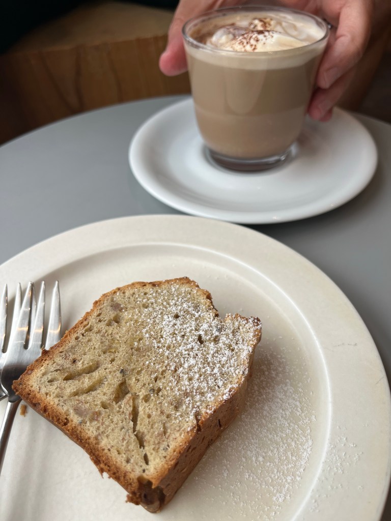 We grab a coffee and cardamom banana bread.