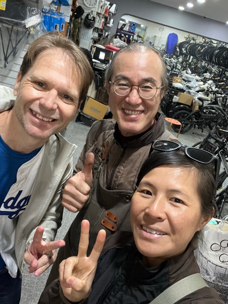 We head to the store to give him the panniers, as well as a small gift that we have brought back from our cycling adventures in Japan.