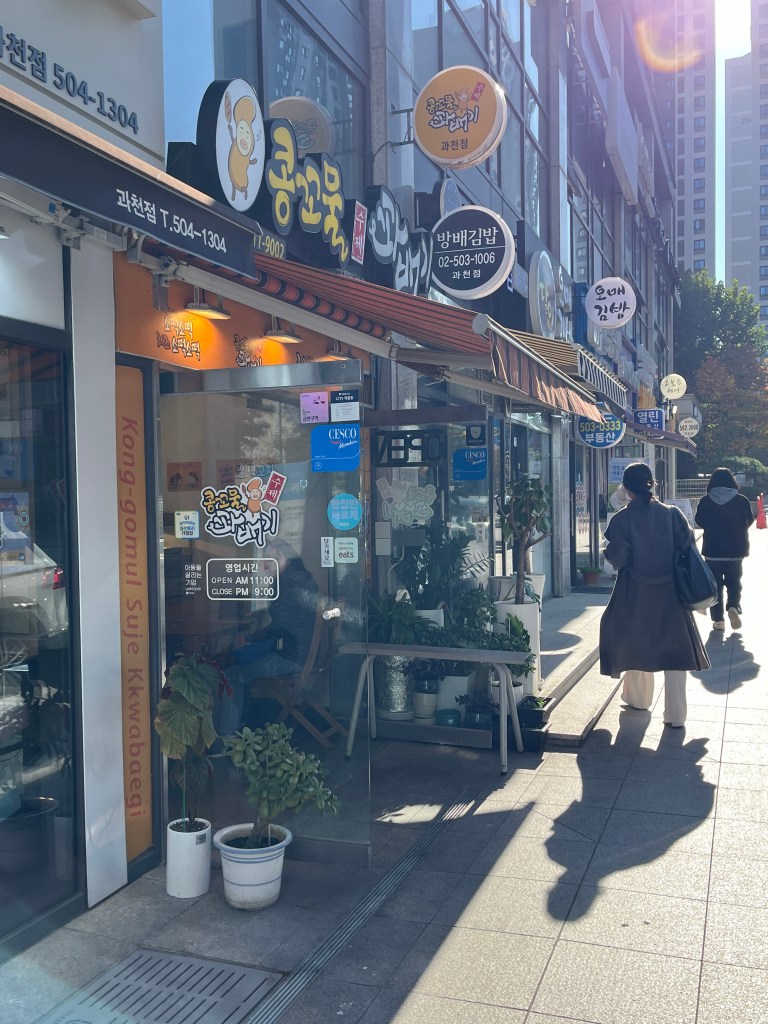 We pass by 콩꼬물수제 꽈배기 ‘Homemade bean curd donuts’, a traditional donut shop that sells all your usual fried bread products including 꽈배기 (twist donuts).