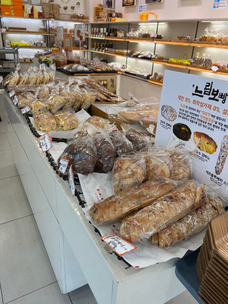 Around the corner is 행복빵집 (Happy Bakery) which has loads of delicious looking products. We are quite full but buy a basil olive & cheese ciabatta for later.