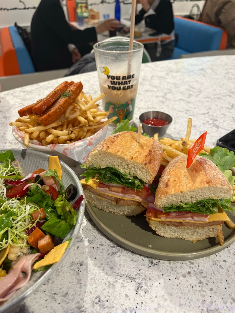 We order the Italian bologna sub, avocado cob salad and an extra side of fries with plant based luncheon meat (spam).