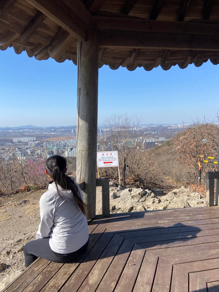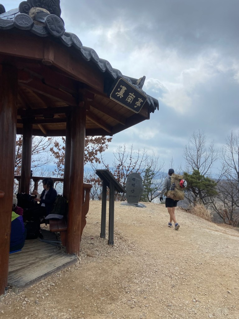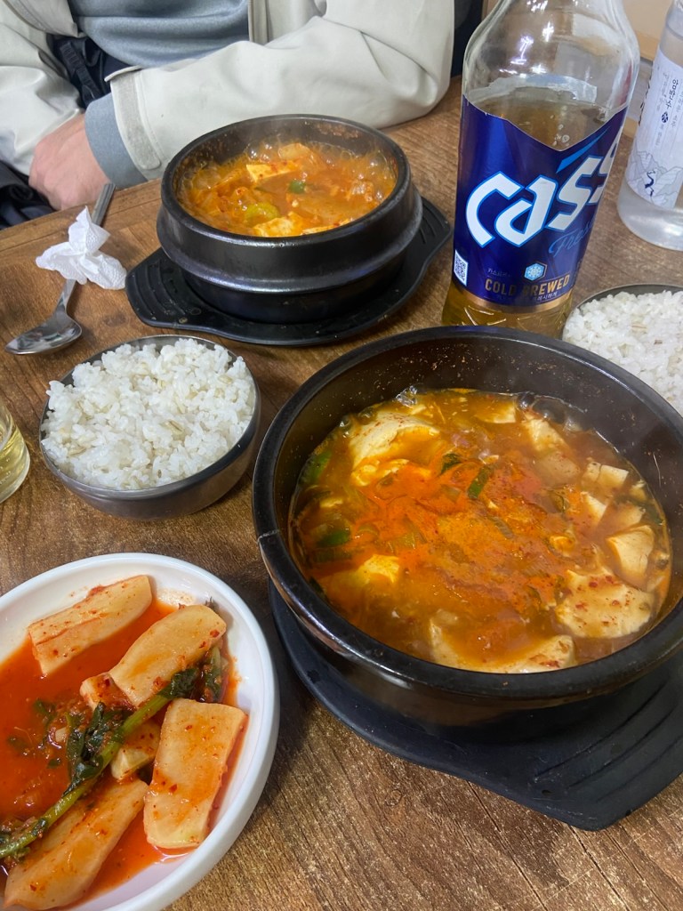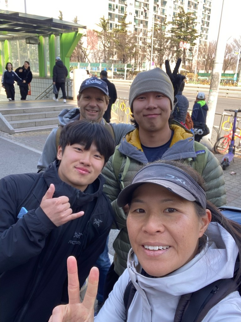 Day 3: Sunday 30 March. Today we completed 16km along course 95, starting more urban and hiking along the river before climbing up 문학산 (Munhaksan Mountain). It was pretty chilly all day with a top of 5°c again, and felt even colder at the peak when the wind picked up. Views were worth it though! After hitting our final checkpoint we had a chat to some friendly locals (팀 and 송) before having some awesome 찌게 (Korean stew) for dinner which really hit the spot 🇰🇷😋