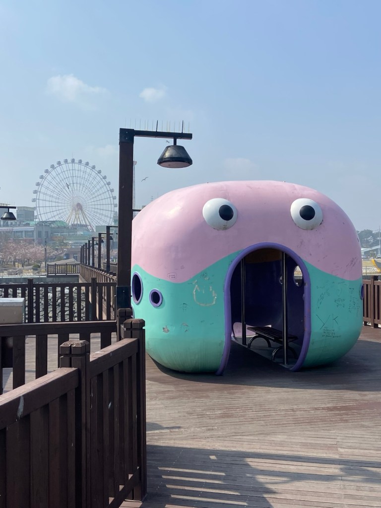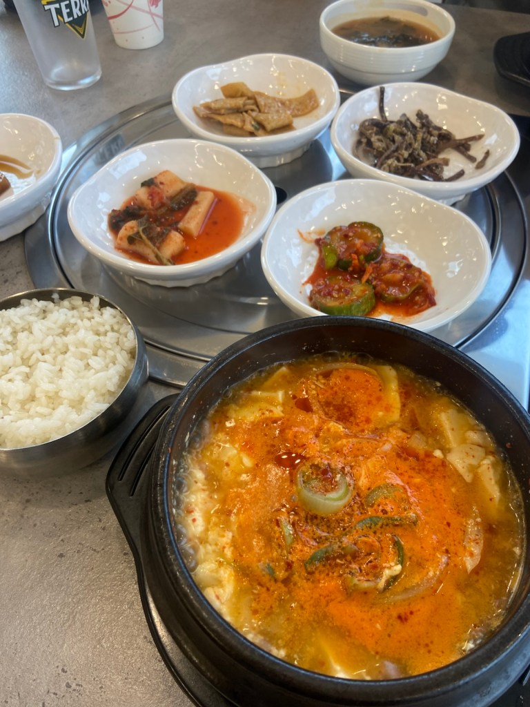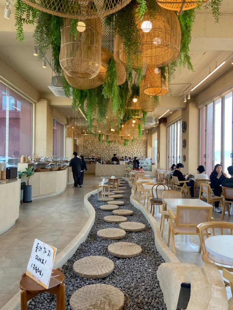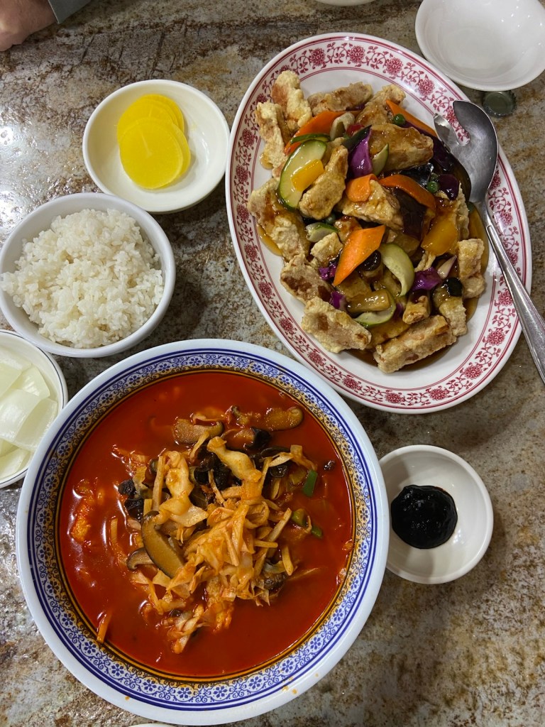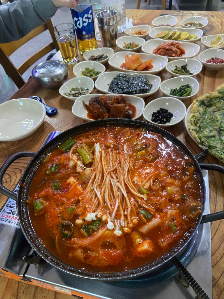 Day 8: Friday 4 April. We knocked out course 89 and started 88 on what was an extremely varied 15km route. We checked out of our haunted love motel mansion and walked along a busy highway for a bit before turning into a deserted camping area which would normally be very busy in the Summer. Took a detour along some trails and hills where there were some lovely views before heading to an awesome bakery cafe 메이플라워 / Mayflower. Finished along the water towards our accommodation for the night at 스위텔 / Suitel. We’re still passing through all the fishing towns but managed to find a place that had 김치찌개 / kimchi stew and heaps of 반찬 / side dishes!