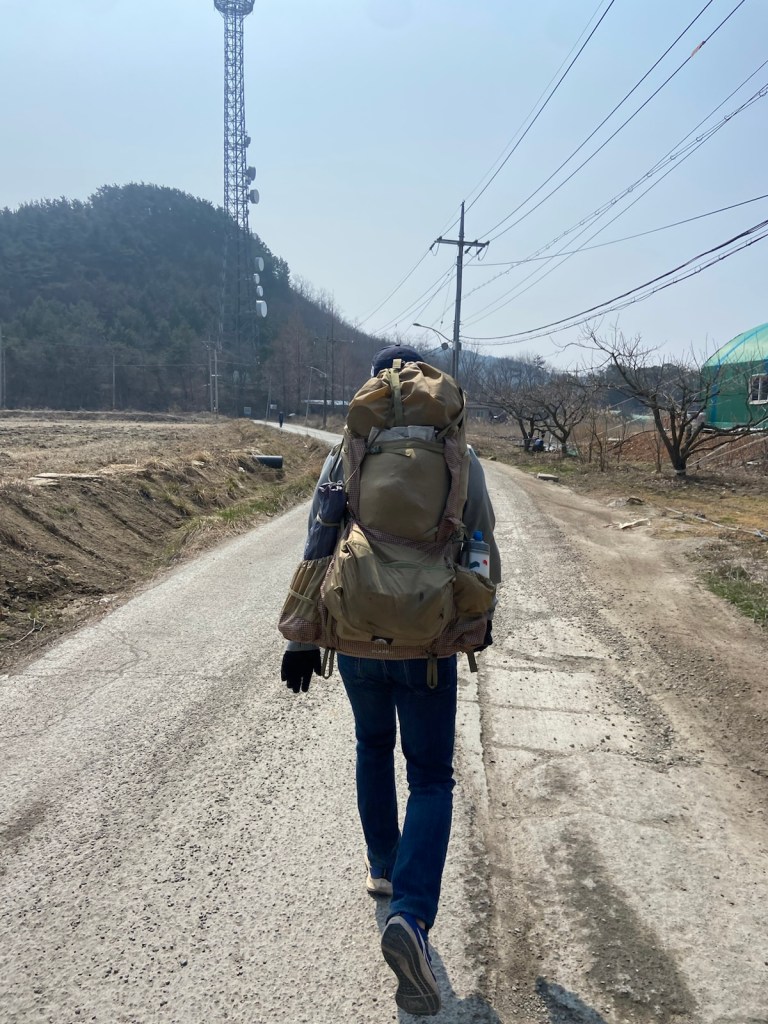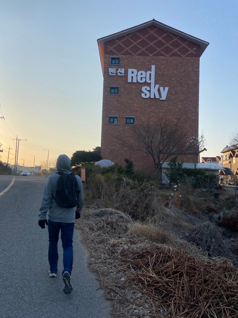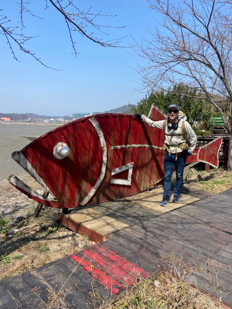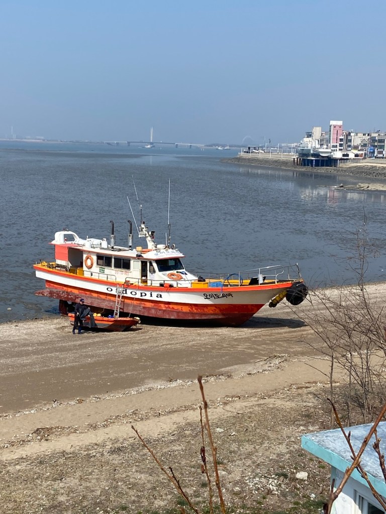 Day 7: Thursday 3 April. Today started like any other day and ended up being one of the most eventful. Course 90 was a flat, cruisy 10km walk through the back streets of 대부도 / Debudo, passing by the odd cafe and barking dog. We started chatting to a lady named 미영 / Miyeong who invited us to a local cafe to try 솔트크림커피 / salt cream coffee ☕️ After a nice chat she then invited us to her house nearby where we met her little old dog Malgeum 🐕 She cooked us a wonderful lunch and we could’ve chatted with her all afternoon. We continued on looking for a coffee shop so we could whip out the laptop and do a bit of Korean study. A short walk later we found a place called Would U Like Cafe where the owner opened up the shop just for us, but instead of studying we ended up chatting to him for an hour or so (real conversation practise instead)! He was lovely and gave us a few gifts including a sachet of grape juice he used to distribute, so we gave him a small clip on koala and a card. He was so thankful he gave us a fold up lamp for our hiking travels. We continued onto our accommodation for the night, which looked like a haunted mansion from the outside and love motel on the inside 🏩