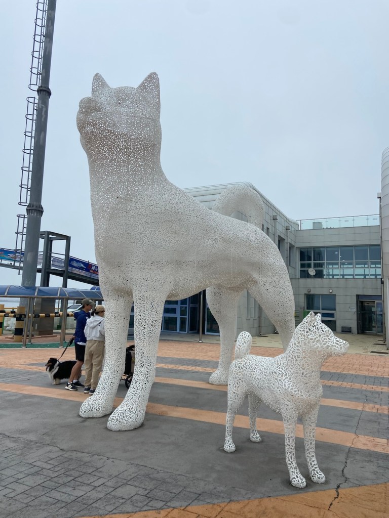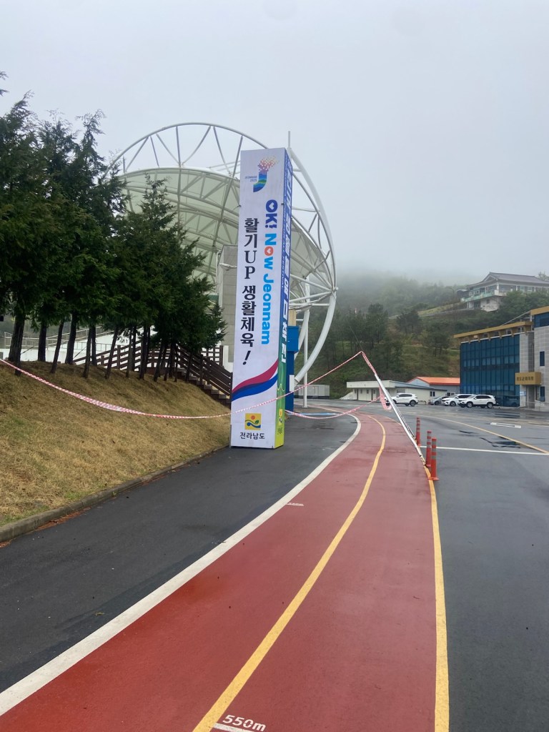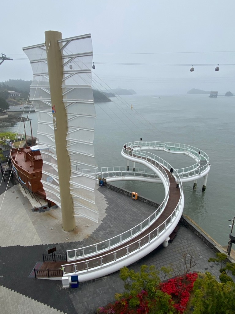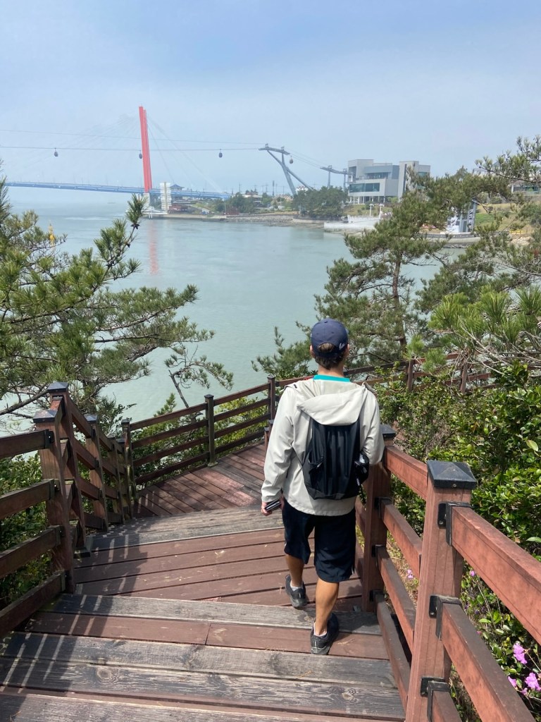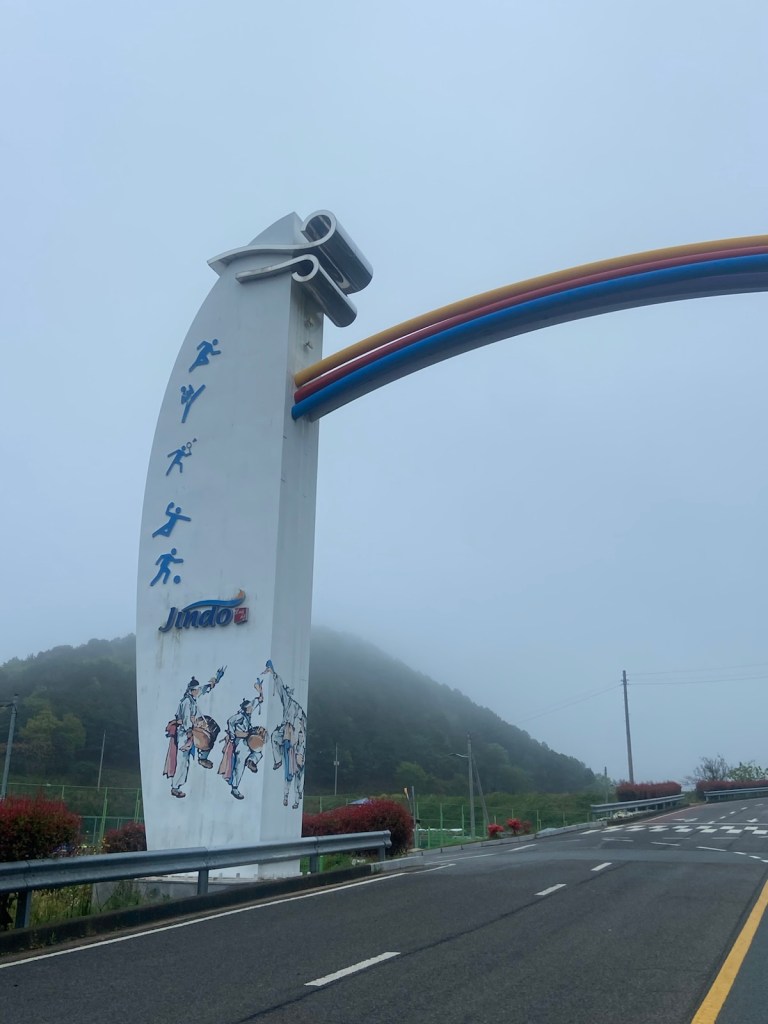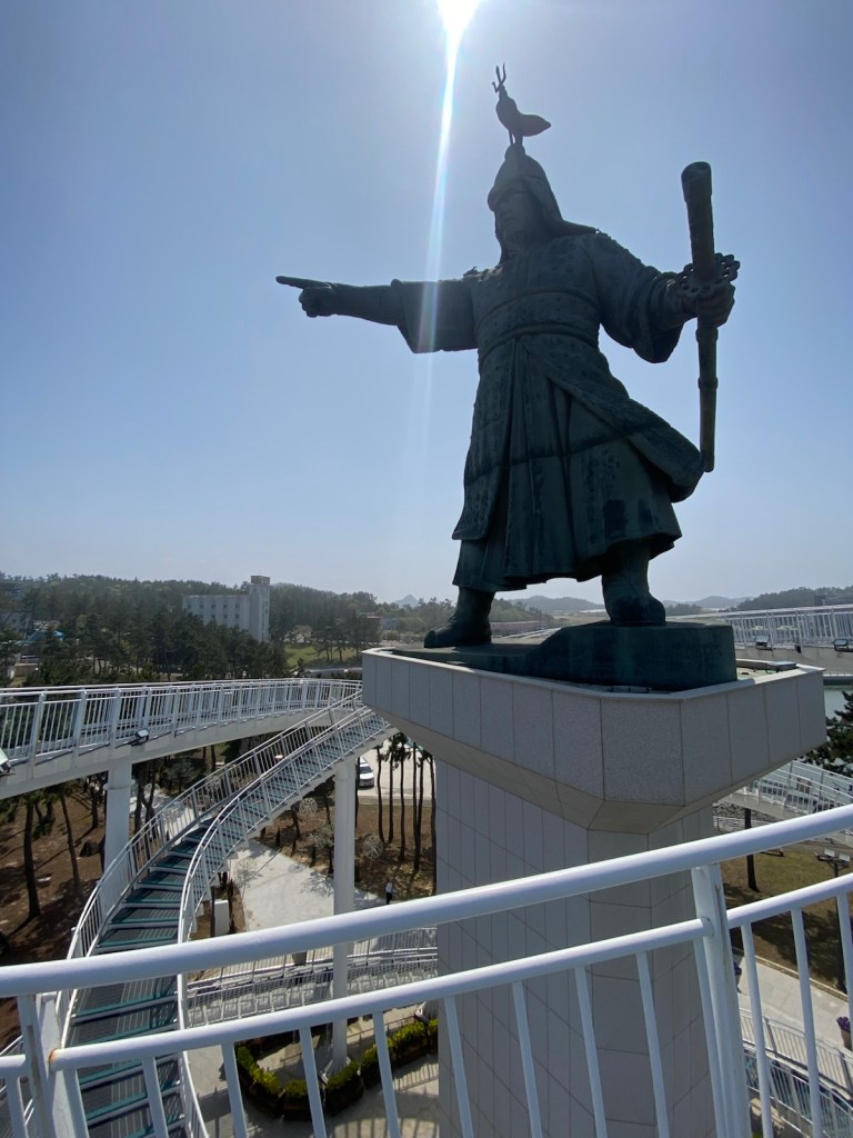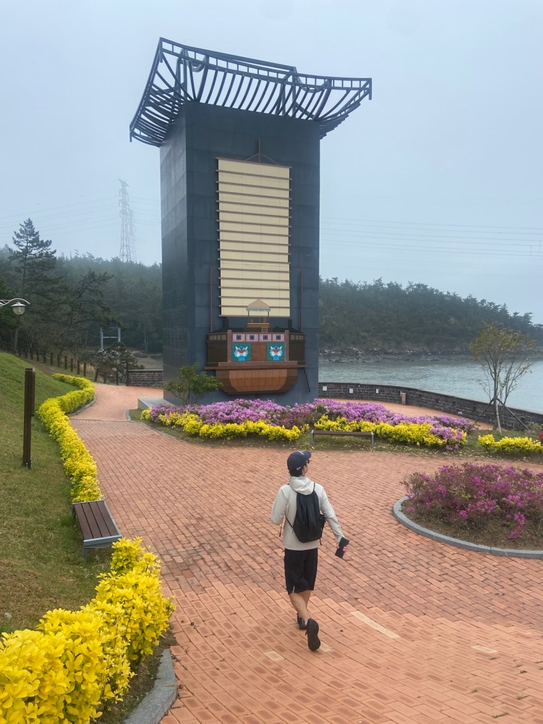 Day 24: Sunday 20 April. The rain from last night was still easing up this morning so it was quite misty and humid today. We knocked out 19km along courses 5 & 6, which were a little different to what we’ve been doing as they took us around some more touristy areas like Jindo Tower, the cable car and Yi Sun Shin statue, which is enormous with a big spiral staircase for viewing 🚡 The course also took us along the water, past farmland and crops, and we finished near the tourist complex for a Chinese lunch, which was so filling that all we could stomach for dinner was some drinks from Mega Coffee later that night 🌙