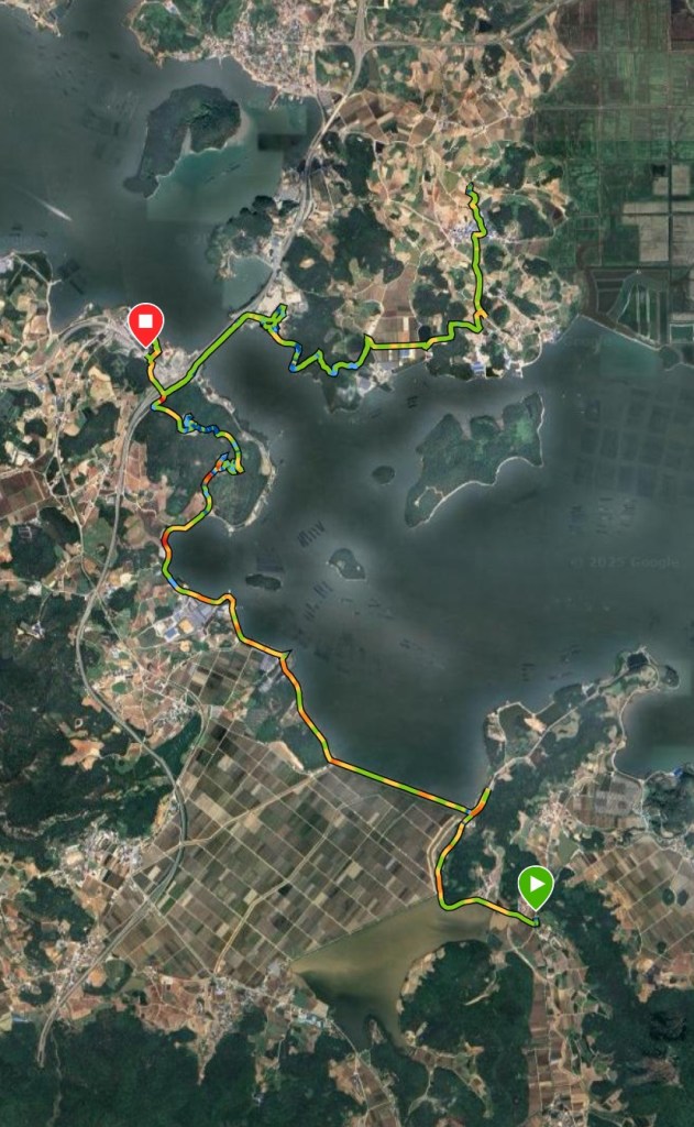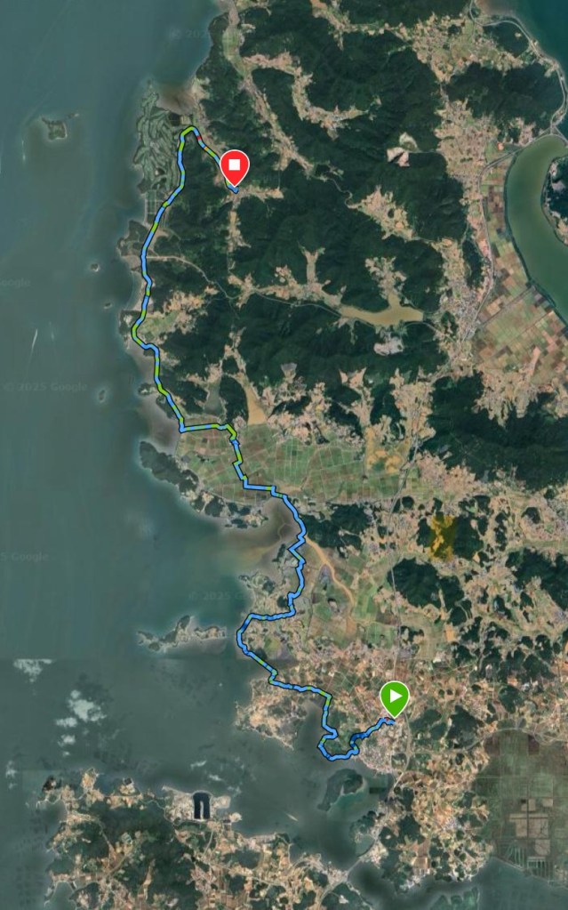Day 27: Wednesday 23 April. We finally departed Jindo and made our way to Munnae-Myeong, a small town part way to Haenam. We completed 22.5km along courses 13 & 14, which took us through farmland, endless fields of vegetables growing and an interesting looking tourist resort and campsite ⛺️ It was pretty quiet but give it a few weeks as they weather warms up and the place will be pumping. For dinner we discovered 백반 (baekban), a meal focusing on the local produce with loads of banchan! 🥬