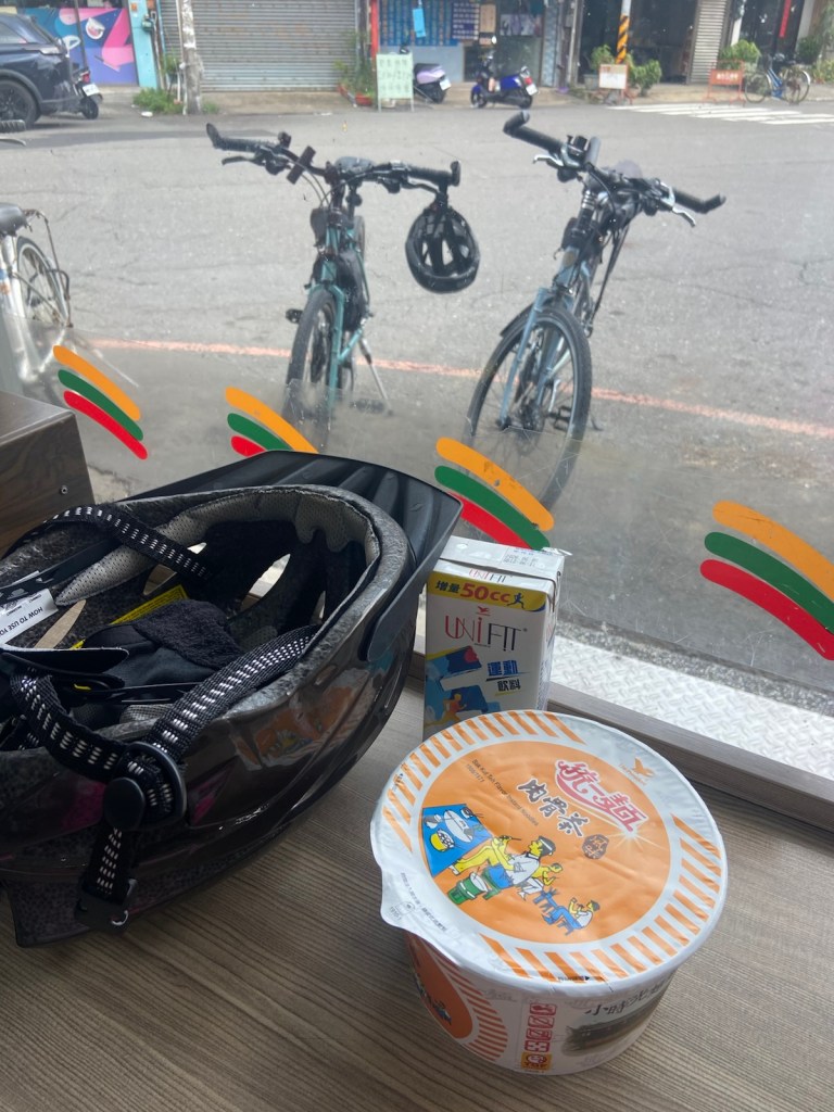 Hsinchu to Baishatun 44km, then train to Shalu. Our destination today is about 90km away but we pull up a bit sore and tired from yesterday’s ride and instead decide to cycle part way (56km) then catch a train the rest of the way. However, the headwind is so brutal today that we only make it 43km before calling it a day 🌬️ We make a lunch stop at the local 7-11 before realising the next train arrives in 10 minutes. The train after that is a 90 minute wait so we make a dash for it and sprint the last 1km to the station to make the train bound for Shalu just in time 🚊 The great part about Taiwan is you can take bicycles onto the train, but what we also discover today is that you need buy a separate ticket for your bike. We only realise this when we arrive at the destination, but fortunately the train staff are very forgiving and we only have to pay the cost of the original ticket rather than a fine 🎫 Check-in for most hotels in Taiwan is quite late (usually 5pm or later, with an additional fee for early check-in) so we stop by a nice coffee shop before making our way to our accommodation, 荷村 Motel 🏨 It’s another love motel style place with security garage to lock our bikes up. The staff member even says we will get McMuffins for breakfast in the morning and gives us a menu to choose from. We have dinner at a local ramen joint and head back to the motel to plan tomorrow’s ride 🚲