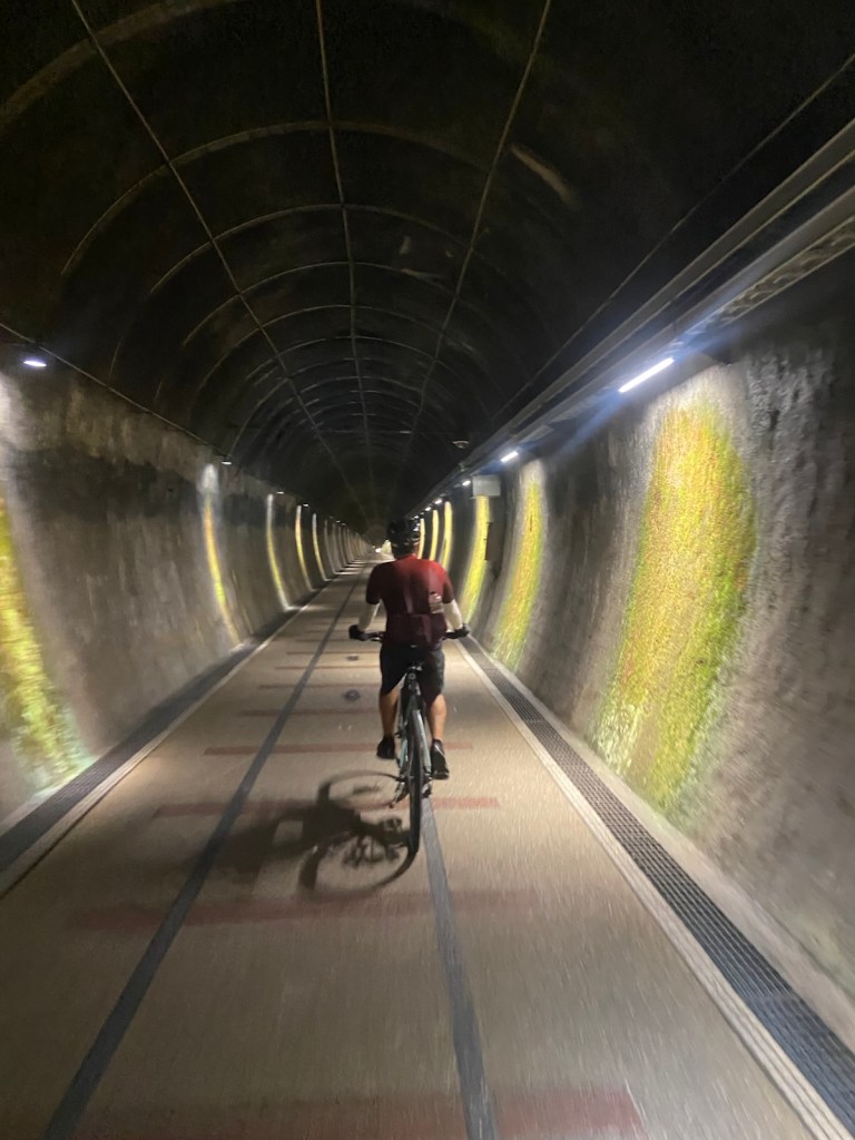 Luodong to Fulong / 51km. A very comfortable day on the bike with just one hill and zero headwind ⛰️ We start along the cycle way heading out of Luodong but keep getting slowed down by these annoying blockades used to prevent scooters from using the path 🏍️ We eventually head onto the highway but the traffic is a bit sketchy; as there is no expressway around this particular area, there are big trucks and taxis being a bit reckless on the local roads. The mountains are to our left and ocean to our right and we see a lot of surfers catching some waves 🌊 The most enjoyable part of our ride today is heading through the Old Caoling Tunnel, a 2.3km stretch exclusive to bicycles only. It’s a very cool, dark tunnel, illuminated with fluro lights with music playing 🎵 It’s a weekday so there aren’t too many other cyclists but you can imagine how busy it would become on a weekend with the area being quite touristy. We arrive in the town of Fulong, which is small but full of foreigners doing day trips from Taipei. Our accommodation is a basic family run inn and it appears we might be the only guests for the night 🌙 As the town is small, dinner is at a small bento box place plus a few things from the local convenience store. As we are about 70km from our end point we only have two days of cycling left!